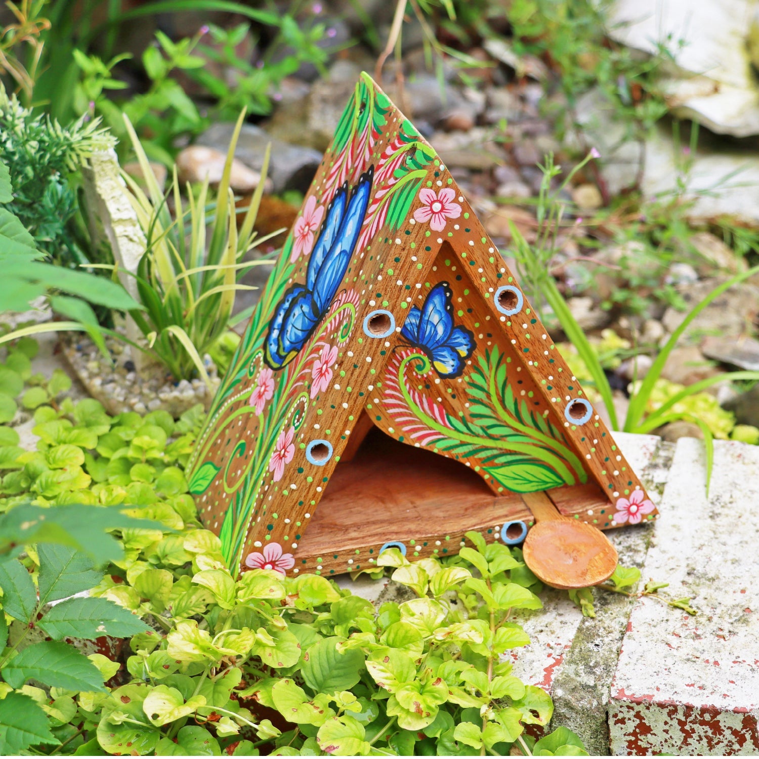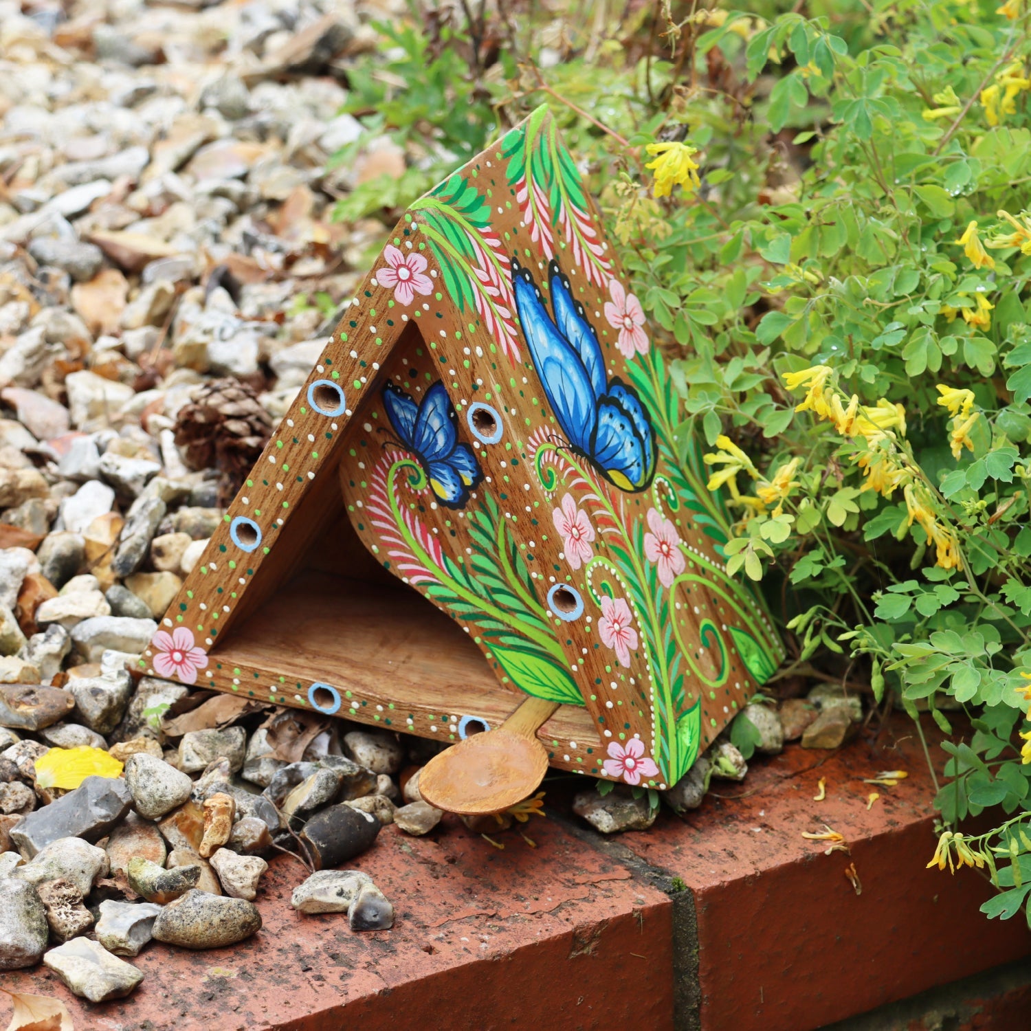 The included removable feeding spoon can be filled with butterfly food, sugar paste, or fruit to attract and nourish your garden’s visitors. Designed in the UK with a Bali wood certification, it’s an eco-friendly and charming addition to any outdoor space.